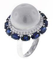 18kt white gold south sea pearl double halo ring with micro prong set round brilliant diamond round halo and prong set oval shape sapphire halo. 12 Oval shape sapphire = 3.60ctw 34 Round diamonds = 0.37ctw 1 South sea pearl = 15.7 Size 6.5