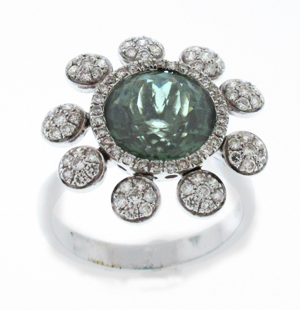 18kt white gold micro pave set round brilliant diamond green tourmaline flower ring total diamonds = 0.50ctw total green tourmaline = 3.27ctw size 6.25