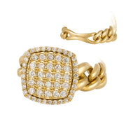 18kt yellow gold micro pave set round brilliant diamond cushion cluster and link flex ring.