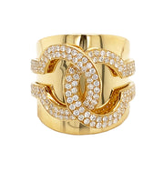 18kt yellow gold micro pave set round brilliant diamond interlocking circle ring.