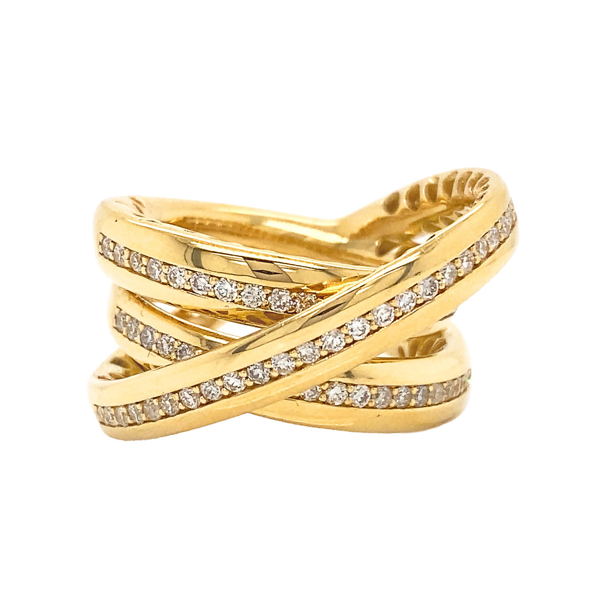 18kt yellow gold micro pave set round brilliant diamond multi-row criss-cross ring.