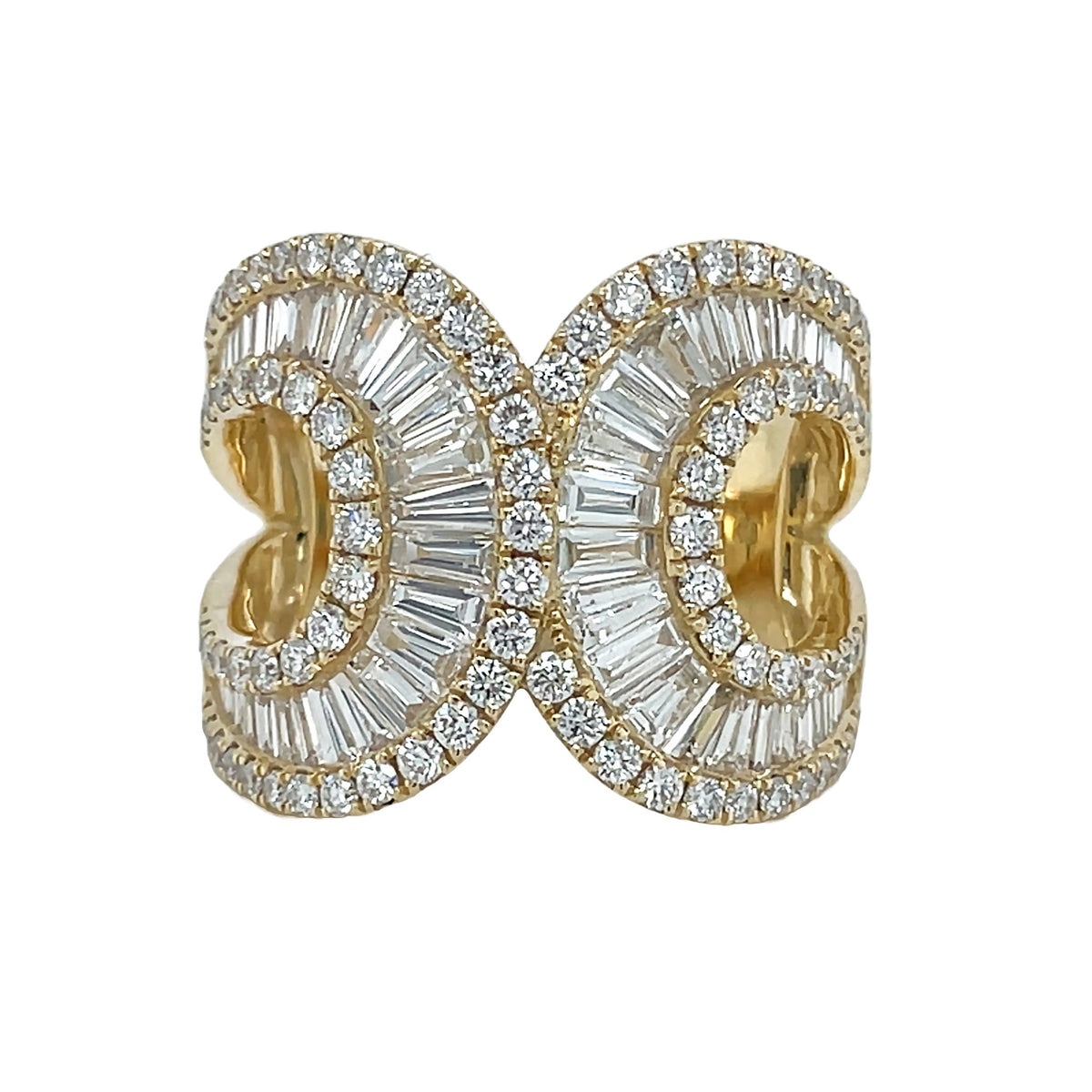 18kt yellow gold micro prong set baguette and round brilliant diamond ring.