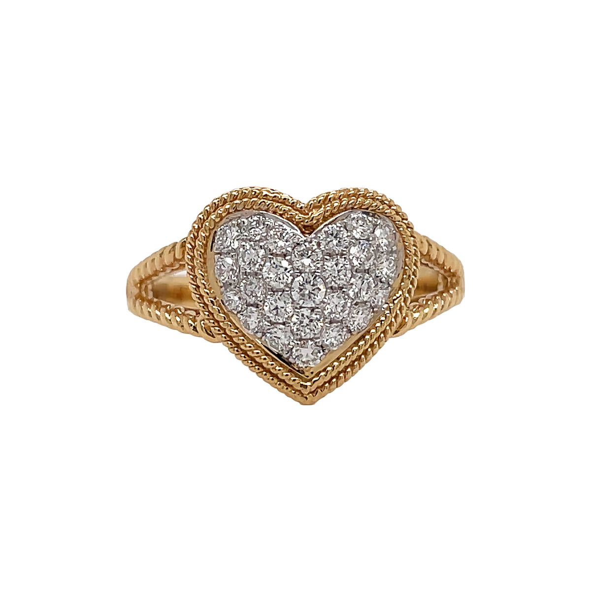 18kt yellow gold micro pave set round brilliant diamond heart shaped ring.