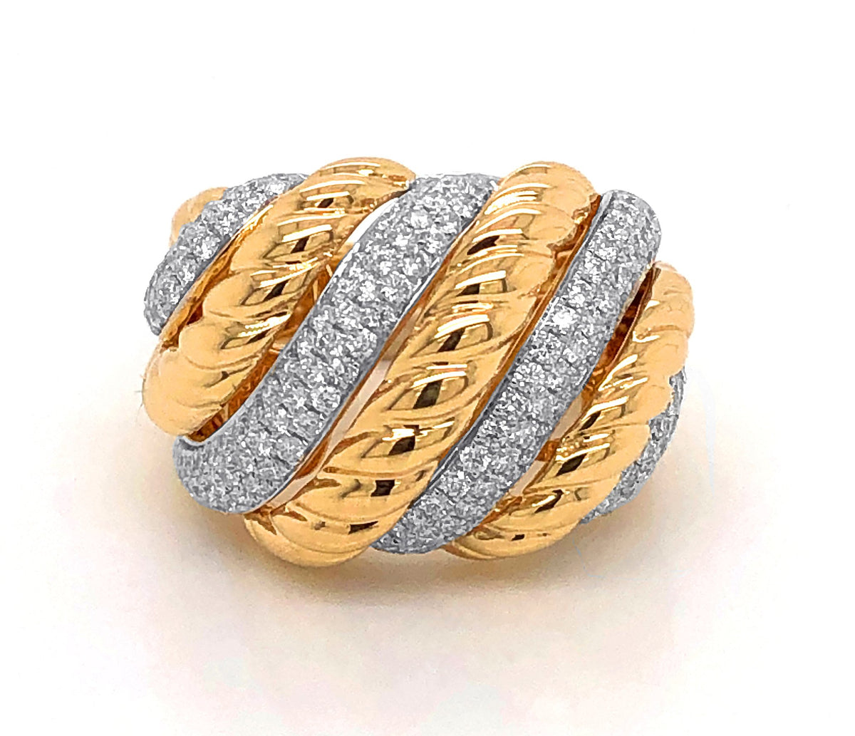 18kt yellow gold micro pave set round brilliant diamond and twisted multi-row ring.