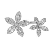 Platinum micor prong set baguette and round brilliant diamond double flower ring.