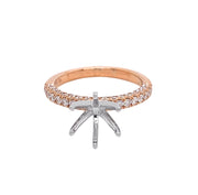 18kt rose and white gold 6 prong semi-mount with micro prong set round brilliant diamond on 3-D shank. 50 round diamonds = 0.65ctw (Head Size: 2ct) Size: 6.5