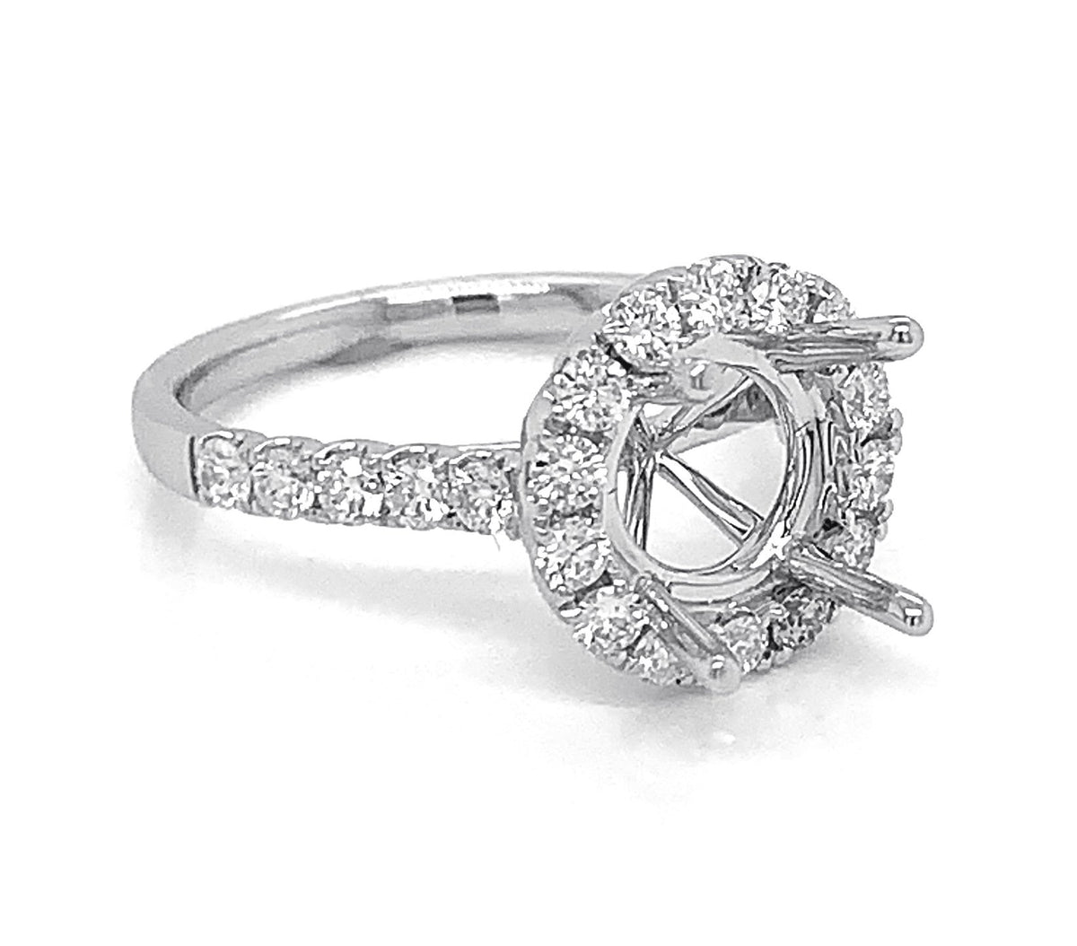 18kt white gold micro prong set round brilliant diamond semi mount with halo and diamonds on shank. 24 round diamonds = 0.78ctw (Head size = 1.5ct) Size = 6.5