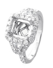 18kt white gold micro prong set round brilliant diamond cushion halo semi mount with prong set trapezoid diamond on each side surrounded by a halo