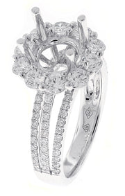 18kt white gold micro and mutual prong set round brilliant diamond round halo semi mount with split shank.
