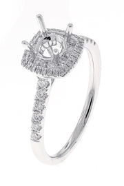 18kt white gold micro prong set round brilliant diamond cushion shape double row halo for round stone semi mount.