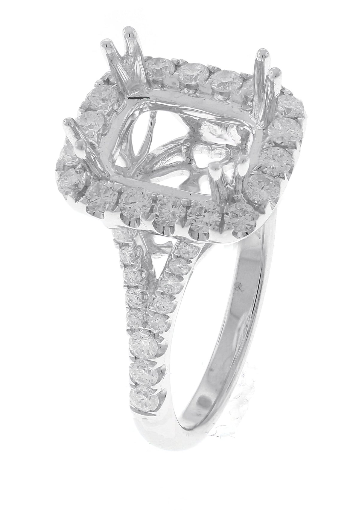 18kt white gold micro prong set round brilliant diamond 8 prong rectangular shaped halo semi-mount with split shank.