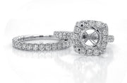 18kt white gold micro prong set round brilliant diamond cushion halo semi-mount for round diamond with matching band. 30 round diamonds on semi-mount = 0.77ctw 17 round diamonds on band = 0.46ctw (Head Size: 1ct)