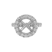 18kt white gold micro prong set round brilliant diamond halo semi-mount with diamonds on the gallery and shank.