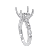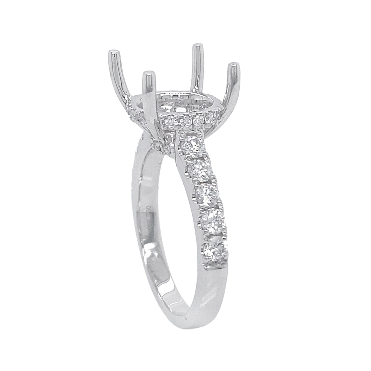 18kt white gold 4 prong semi-mount with micro prong set round brilliant diamond on gallery and shank.