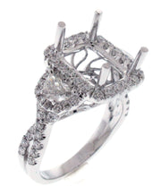 18kt white gold micro prong set round brilliant diamond cushion halo semi mount with 2 prong set half moon diamonds on sides and twisted shank