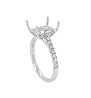 18kt white gold 4 prong semi-mount with micro prong set round brilliant diamond on gallery and shank.