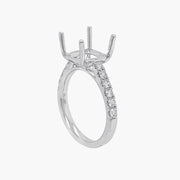18kt white gold 4 prong cushion semi-mount with micro prong set round brilliant diamond on the shank.