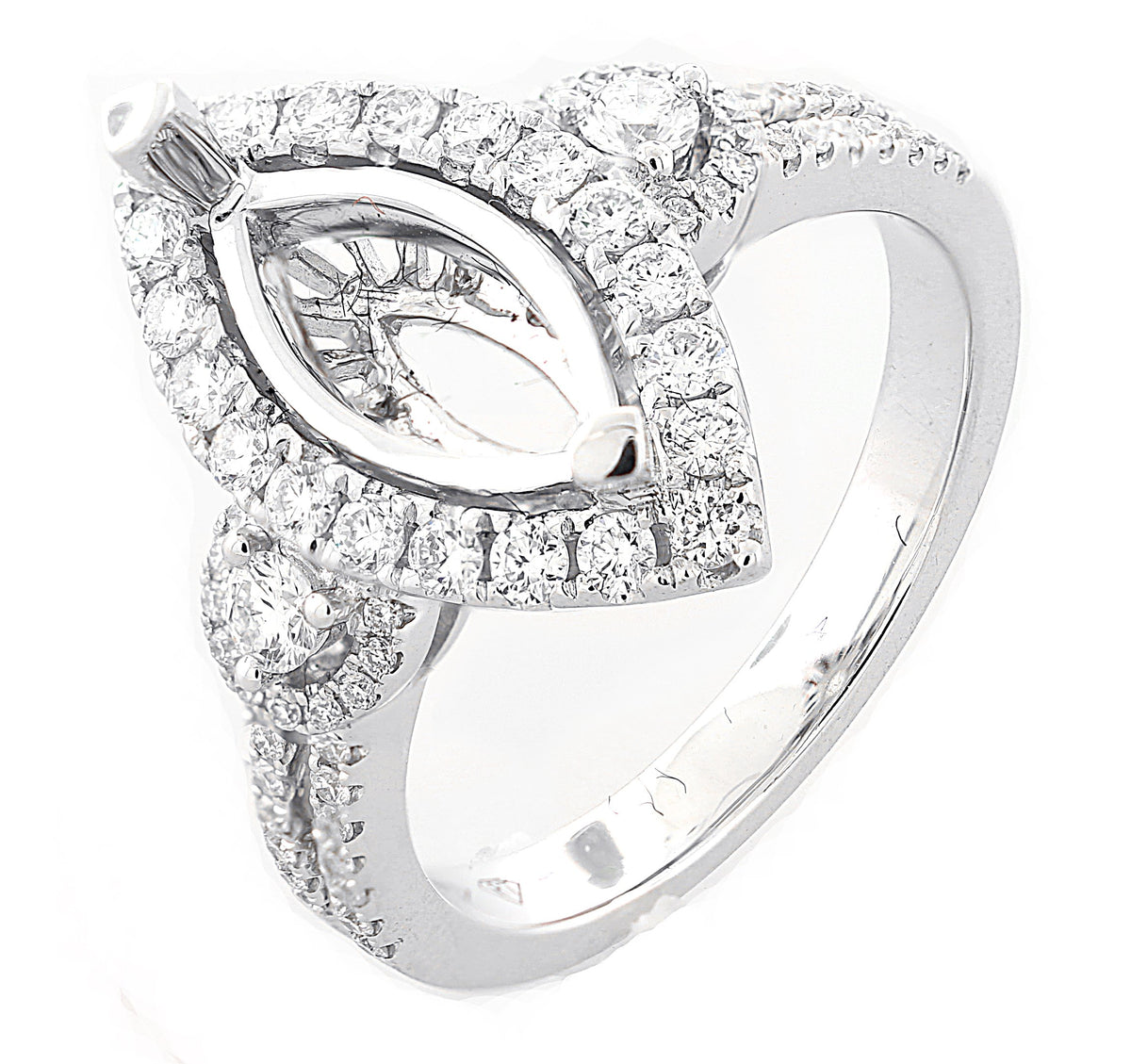 18kt white gold micro prong set round brilliant diamond marquise halo semi mount with round briliant diamond side stones surrounded by micro prong set round brilliant diamond halos and a split shank