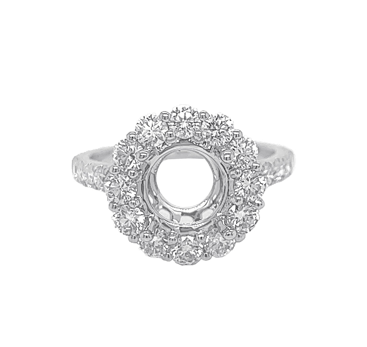 18kt white gold mutual prong set round brilliant diamond halo semi-mount for round diamond.