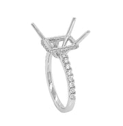 18kt white gold micro prong set round brilliant diamond under-halo semi-mount for emerald cut stone.