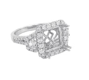 18kt white gold 4 prong set trapezoid diamond 3 stone semi-mount with micro prong set round brilliant diamonds on halo and shank.