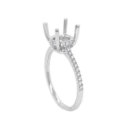 18kt white gold 4 prong semi-mount with micro prong set round brilliant diamond on gallery and shank.