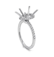 18kt white gold micro prong set round brilliant diamond 5 prong under-halo semi-mount for pear shape diamond.