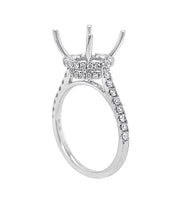 18kt white gold 4 prong round semi-mount with micro prong set round brilliant diamond on the shank and gallery.