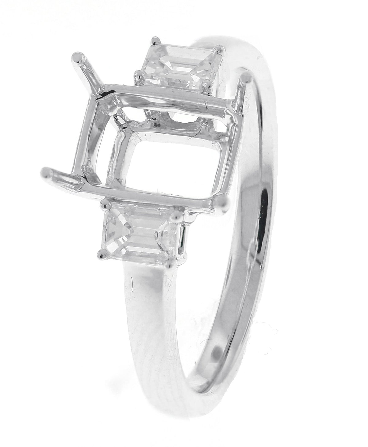 18kt white gold 4 prong semi mount with 4 prong set emerald cut diamonds on each side.
