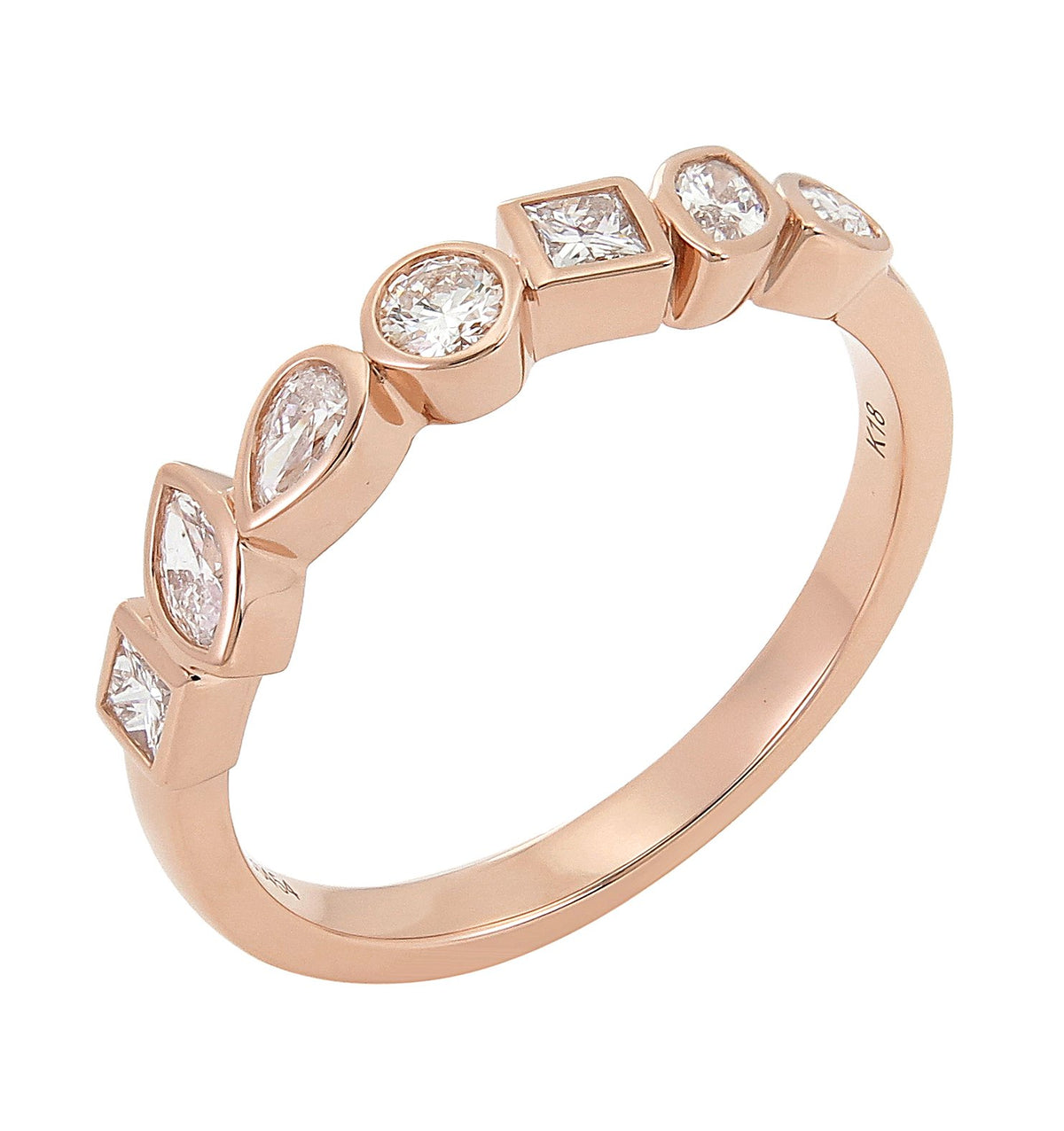 18kt rose gold bezel set marquise, pear, princess and round brilliant diamond 7-stone band.