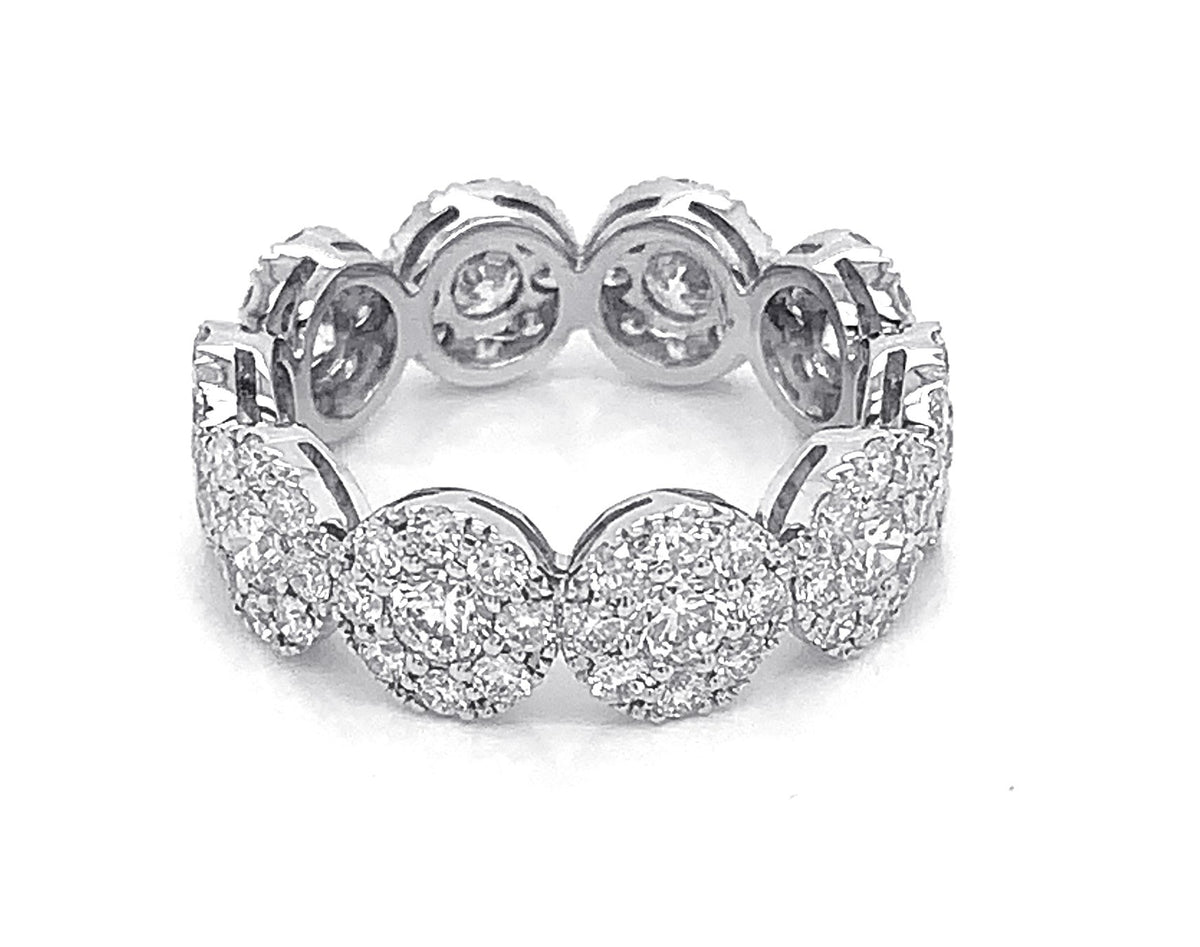 18kt white gold micro prong set round brilliant diamond multi-cluster band.