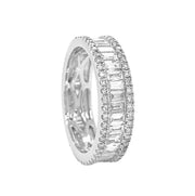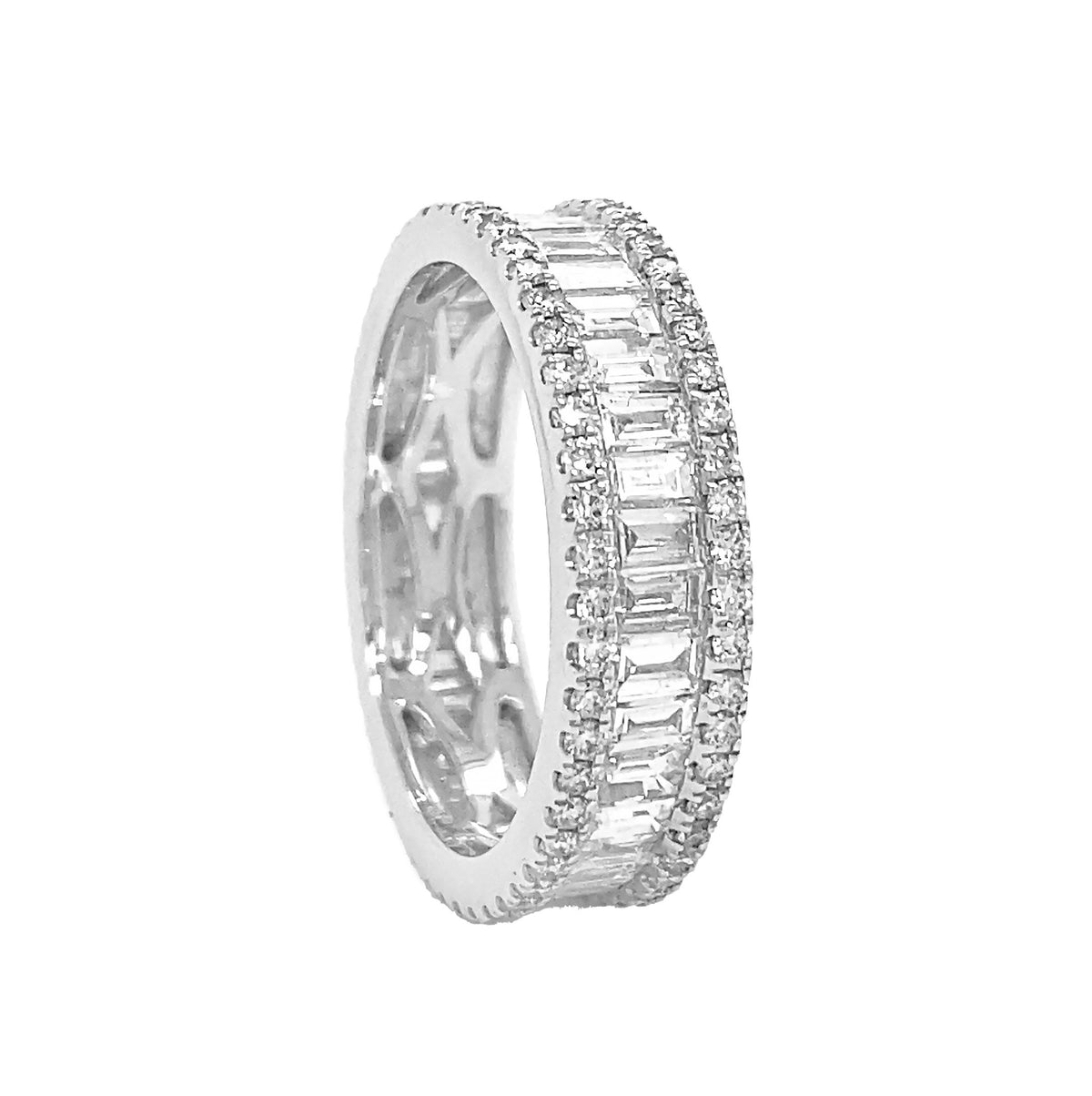 18kt white gold micro prong set round brilliant diamond and channel set baguette diamond eternity band.