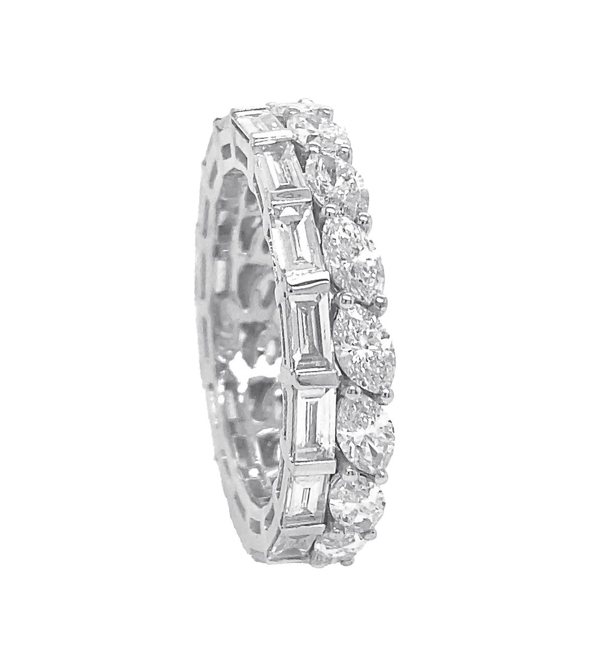 18kt white gold prong set marquise and channel set baguette diamonds 2-row band.