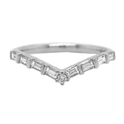 18kt white gold channel set baguette and prong set round brilliant diamond v-shaped band.