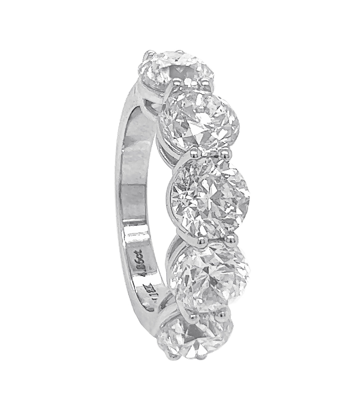 18kt white gold mutual prong set round brilliant diamond 5-stone band.