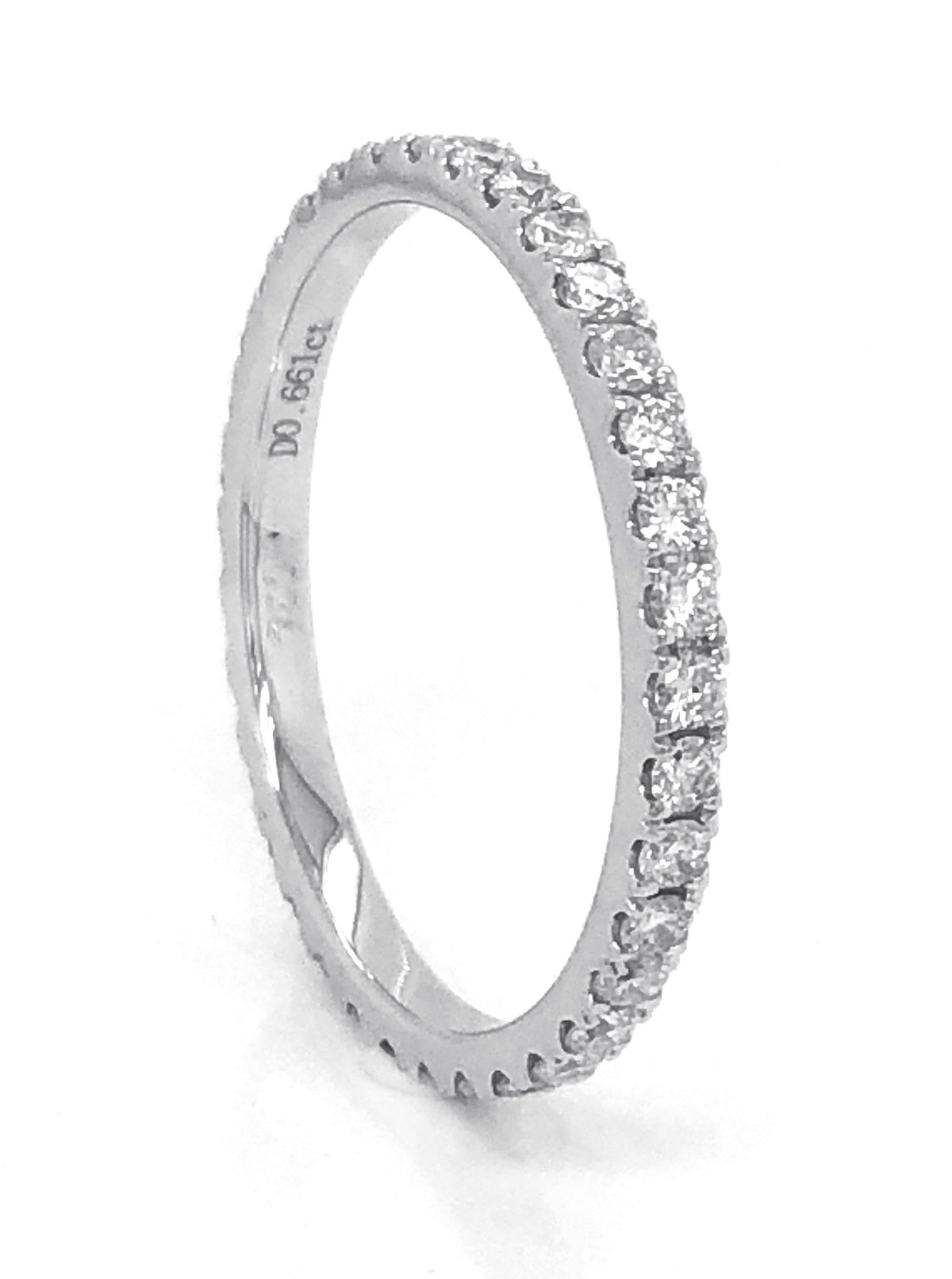 18kt white gold micro prong set round brilliant diamond eternity band.