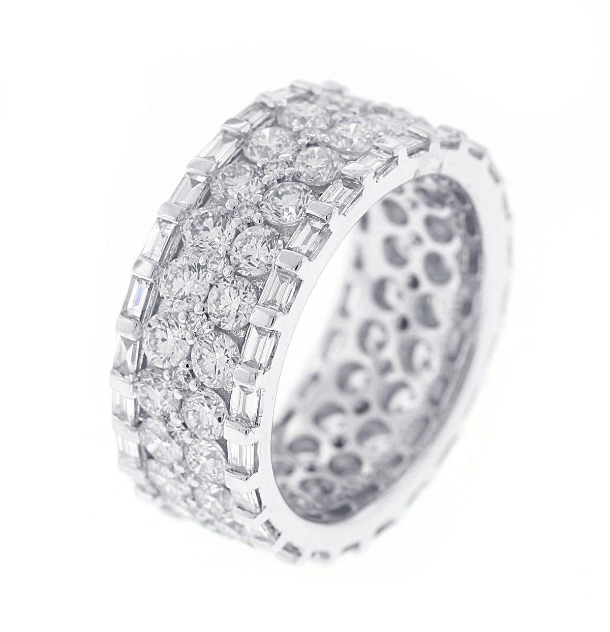 18kt White gold mutual prong set round brilliant diamond and double row baguette diamond wide band