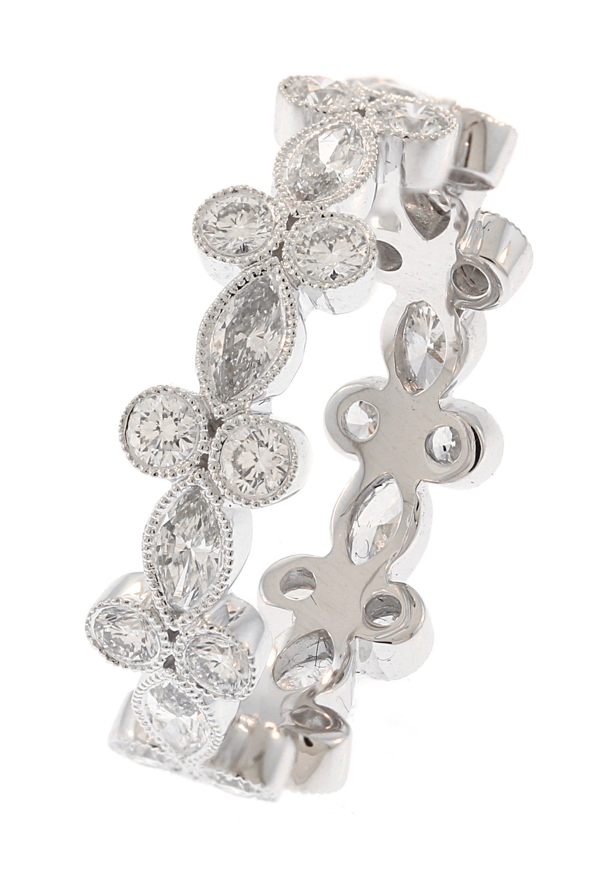 18kt white gold bezel set marquise diamond and bezel round brilliant diamond band with mill grain etching (marquise and two round alternating design)