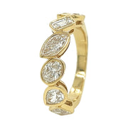 18kt yellow gold bezel set marquise, pear, oval and emerald cut diamond half-way band.