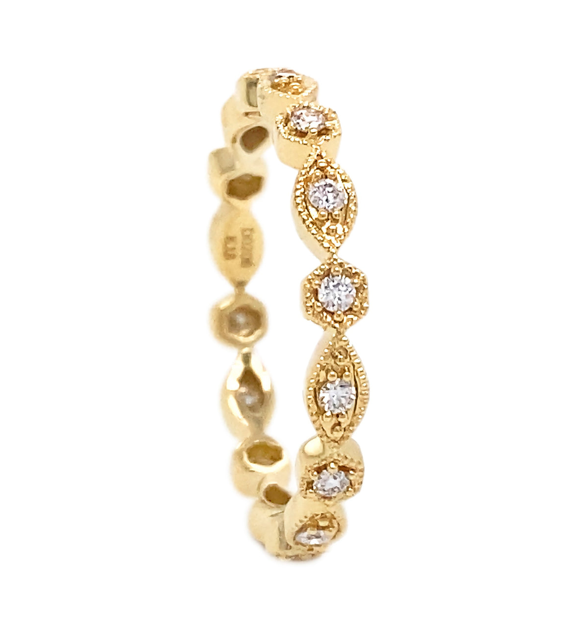 18kt yellow gold micro pave set round brilliant diamond alternating marquise shaped eternity band.