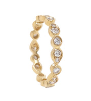 18kt yellow gold micro pave set round brilliant diamond alternate pear shaped eternity band.