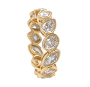 18kt yellow gold bezel set emerald, pear, oval and marquise shaped diamond eternity band.