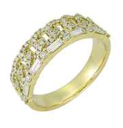 18kt yellow gold prong set baguette and round brilliant diamond 2-row link design band.