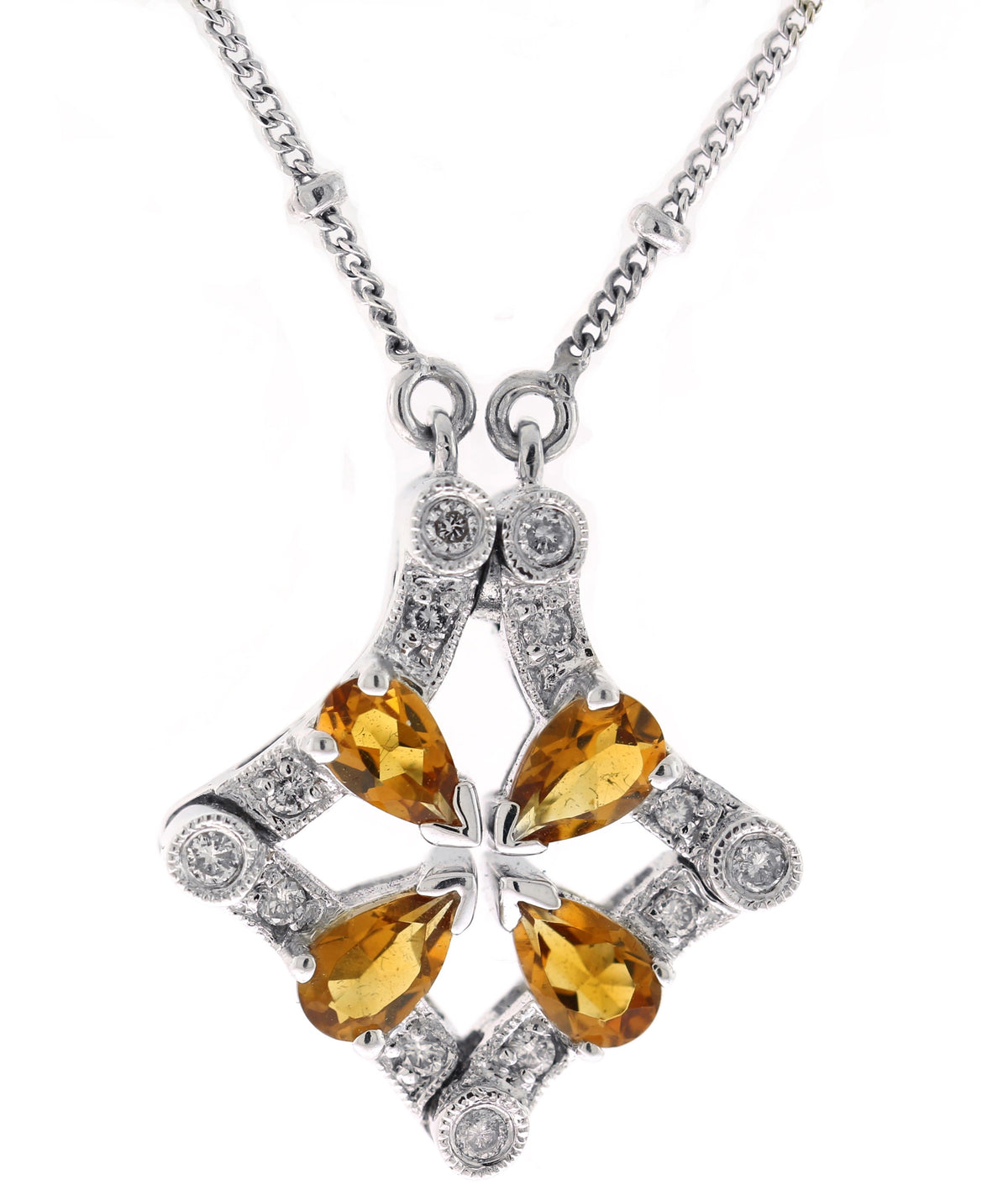 14kt white gold prong set pear shape citrine and micro pave set round brilliant diamond pendant, convertable to necklace citrine = 0.80ctw diamonds = 0.16ctw