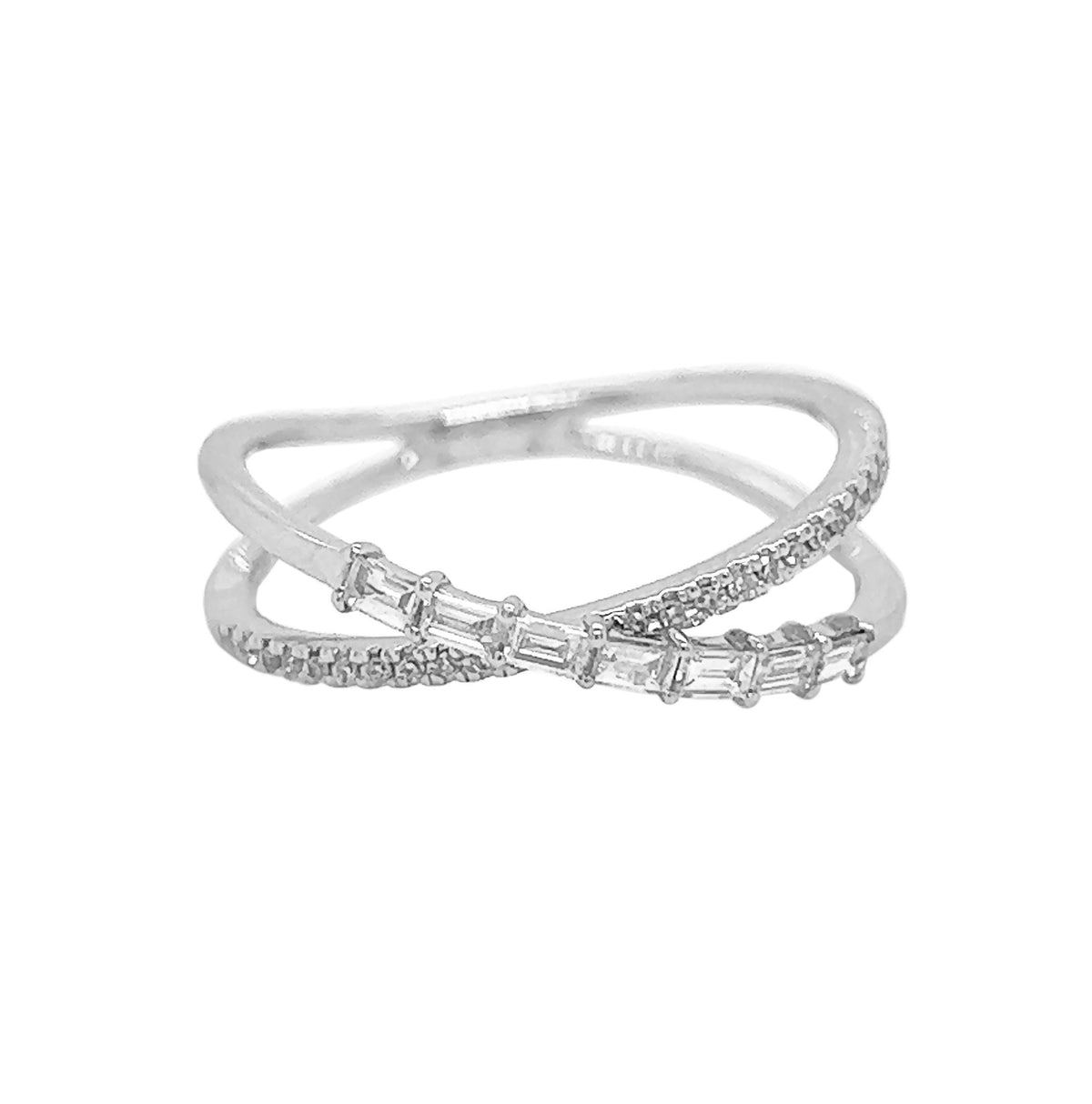 14kt white gold mutual prong set baguette diamond and micro prong set round brilliant diamond criss-cross ring.