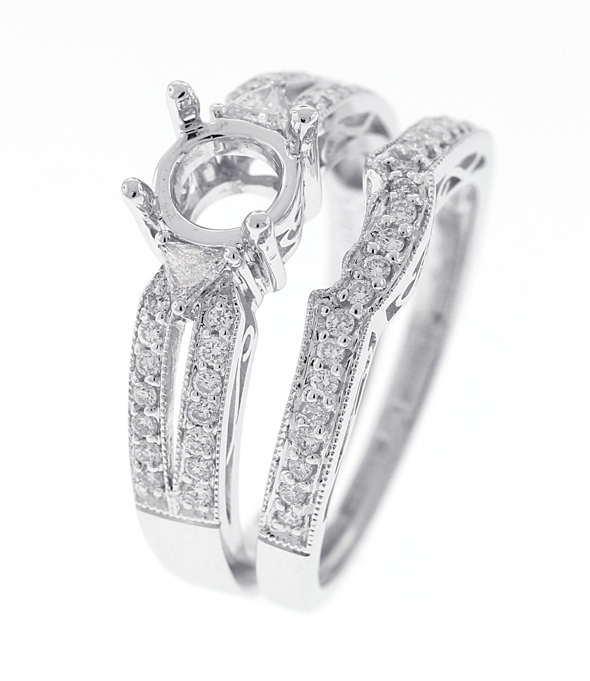 14kt white gold micro pave set round brilliant diamond and prong set trillion semi mount with split shank and a micro pave set round brilliant diamond matching curved band.