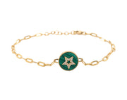 14kt yellow gold micro prong set round brilliant diamond and malachite disk and star bracelet.