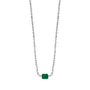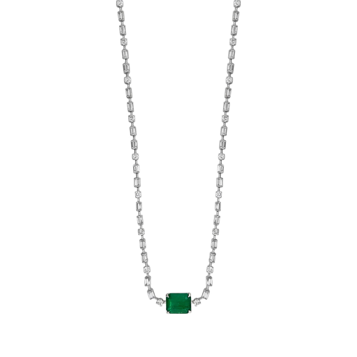 18kt white gold 4 prong set green emerald, channel set baguette and prong set round brilliant diamond tennis necklace. 1 green emerald = 2.51carat 64 baguette diamonds = 1.59ctw 18 round diamonds = 1.38ctw