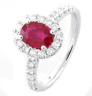 18kt white gold micro prong set round brilliant diamond oval halo ring with a oval ruby set into center