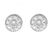 18kt white gold 3 prong set GIA certified round brilliant diamond earring with micro prong set round diamond halo.